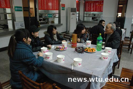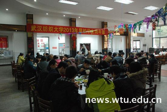 2月4日,是南方农历小年,万家团圆的日子。中午12时,学校南湖校区教工食堂张灯结彩、暖意浓浓,洋溢着一派节日的喜庆氛围,2013年寒假留校学生新春团拜会暨团年宴会在这里举行。副校长潘慧明,校党委副书记、纪委书记刘功成与寒假留校学生一起欢聚一堂,同吃团年饭,共迎新年。校学工部、团委、后勤集团等有关职能部门负责人、部分学院分党委书记、副书记以及辅导员参加了团拜会,师生们喜笑颜开,同述师生情,互道同窗谊,共同举杯,迎接2013年春节的到来。