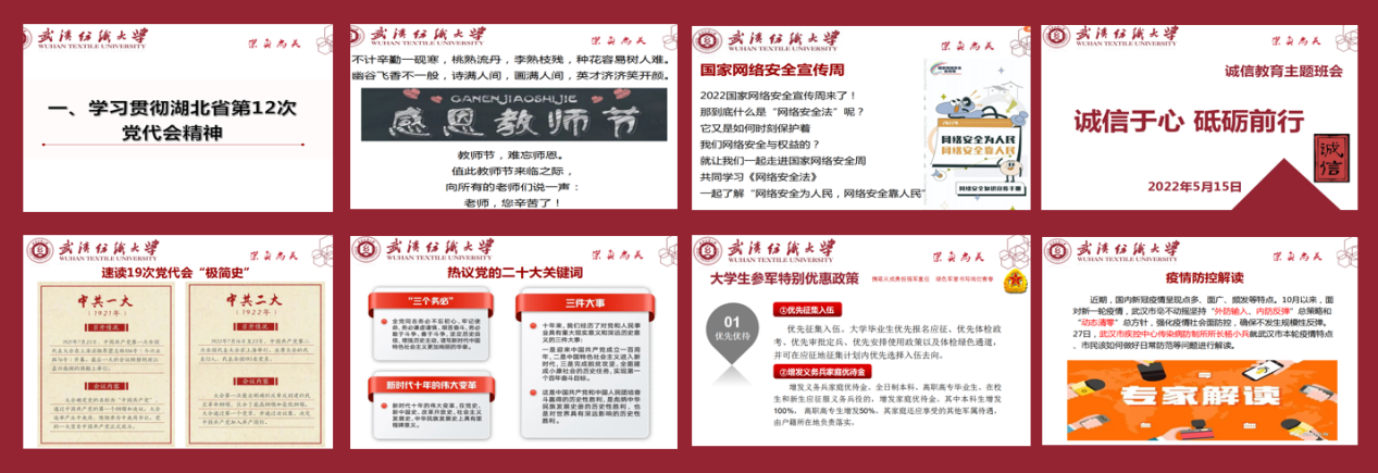 10.多措并举加强学生思政工作,提升工作实效。推进“一周一主题”课程化班会,发布“揭榜挂帅”活动16项,组织2万人开展思想政治问卷调查,成立“纺大青年说”二十大精神学生宣讲团,发布思政课题15项,积极申报省级思政课题。