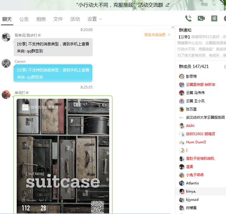 为帮助同学们克服拖延积极行动,勇于接纳自己、直面困难挑战,成长为更好的自己,学校心理健康教育中心云翼服务团启动开展“小行动大不同,克服拖延”系列活动,活动将持续两个月。活动启动一天时间,报名人数就近500人,报名结束后,将根据目标主题进行分类, 以50人左右的群组进行打卡、管理。