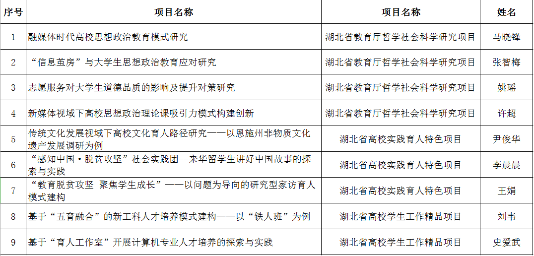 近日,湖北省教育厅公示了2020年度哲学社会科学研究项目、高校学生工作精品项目和实践育人特色项目立项评审结果,学校共计获批9项立项资助,学生工作队伍科研立项工作再创佳绩。