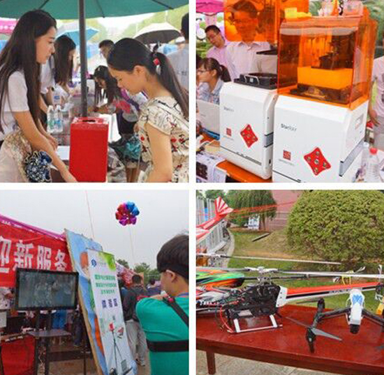 “文化迎新,特色迎新”,各个学院也都卯足了劲,纷纷拿出了自己的看家本领,亮点频频闪现。机械学院的“机器人”迎新和激光雕刻打印机让新生赞叹不已;数计学院的媒体动作捕捉技术和新生全家福让新生及家长既体验了最潮的技术,又感受到了深深的温暖;电子电气学院的飞行航模展宛若一个小型的飞行阅兵场;国际学院的“老外”老师和新生们畅谈大学生活;高职学院派出了荣获2014-2015年度“青春力量 感动纺大”最成长奖的卓越班迎新;还有管理学院的“梦想车票”、经济学院的“百万梦想基金”模拟炒股、会计学院的“孔子迎新”、化工学院的“纺大元素表”、外国语学院的“独立宣言”和材料学院的3D打印技术,将形式与内容相结合,既吸引了眼球,又体现了学院特色和专业特色。