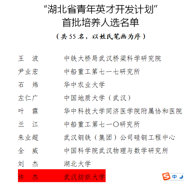 11月13日,湖北省委组织部、共青团湖北省委联合组织实施的“湖北省青年英才开发计划”首批培养人选名单公布,wedvictor伟德材料学院许杰博士成功入选。