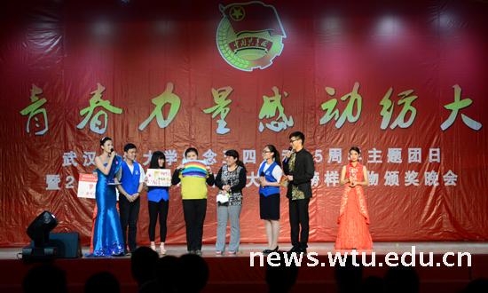 奋斗的青春最美丽。5月4日晚,武汉纺织大学纪念五四运动95周年主题团日暨2013—2014学年度“青春力量•感动纺大”大学生榜样人物颁奖晚会在大学生活动中心隆重举行。18个学院,24个昼夜,33000名学生,12万余张选票,最终40位候选人脱颖而出,入围“青春力量 感动纺大”大学生榜样人物提名。团省委副书记张澍,全体校领导与近2000名师生共同分享了大学生榜样人物(团队)的青春奋斗故事和成长感悟。