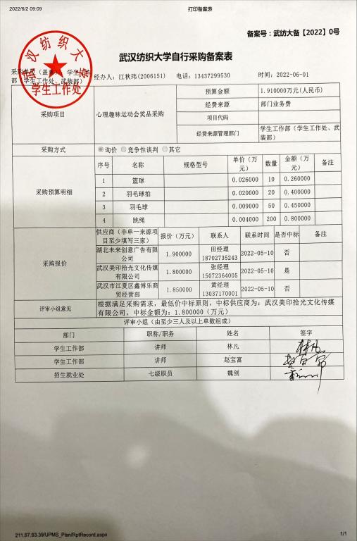 心理趣味运动会采购项目的“武汉纺织大学自行采购备案表”扫描件见下图,按照《武汉纺织大学2019年政府集中采购目录及标准》文件要求,现予以公示7个工作日,公示日期为2022年6月2日-6月9日。公示期间,如对采购结果有异议,请于6月9日16:00前与我部门联系并如实反映情况。
