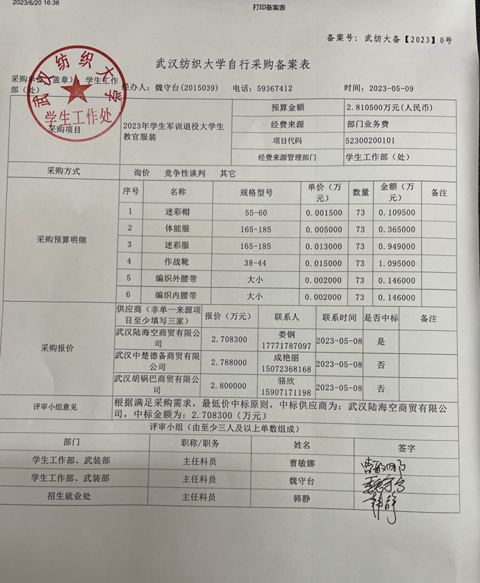2023年学生军训退役大学生教官服装的“武汉纺织大学自行采购备案表”扫描件见下图,按照《武汉纺织大学2019年政府集中采购目录及标准》文件要求,现予以公示7个工作日,公示日期为2023年5月9日-5月15日。公示期间,如对采购结果有异议,请于5月15日16:00前与我部门联系并如实反映情况。