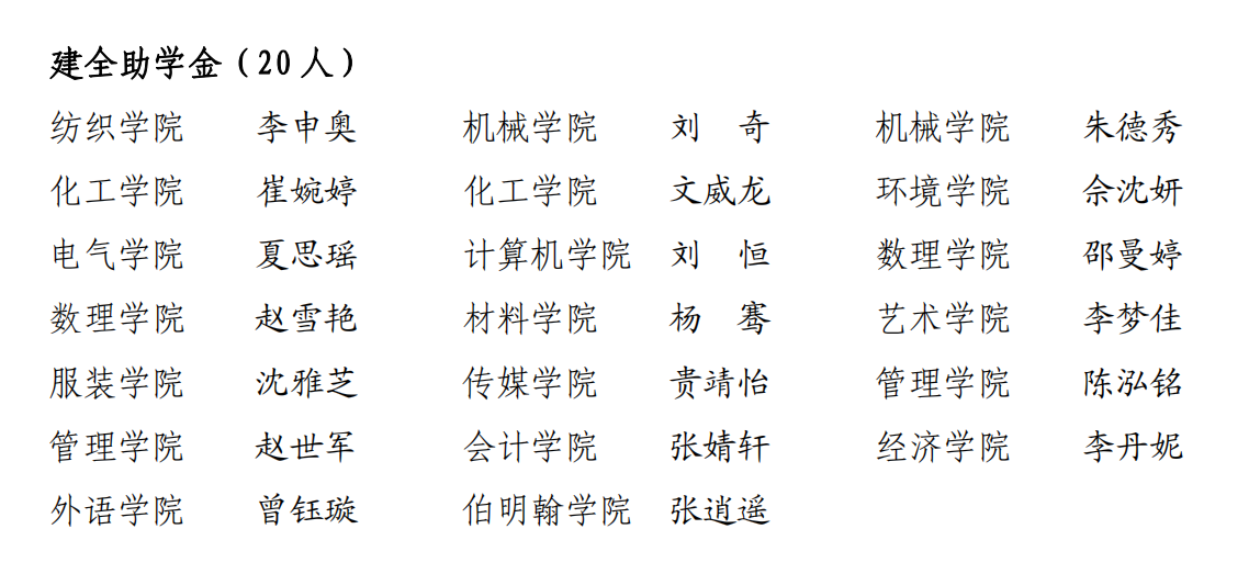 根据《武汉纺织大学“建全助学金”评选办法》有关规定,经个人申请、学院初评、学校复审,拟推荐以下20人为wedvictor伟德2023年建全助学金拟资助学生,现予以公示(排名不分先后):