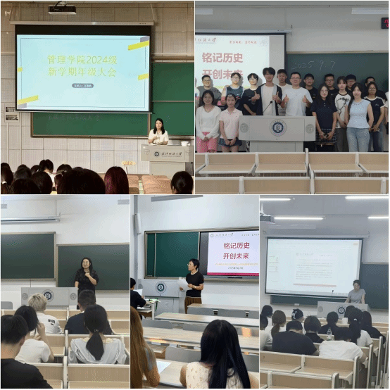 2025年9月7日,管理学院各班级在班主任与辅导员的主持下,组织开展了以“铭记历史开创未来”为主题的新学期第一次班会,围绕爱国主义教育、抗战精神传承、新学期规划以及校园安全教育等内容展开,引导学生以饱满的精神状态迎接新学期。