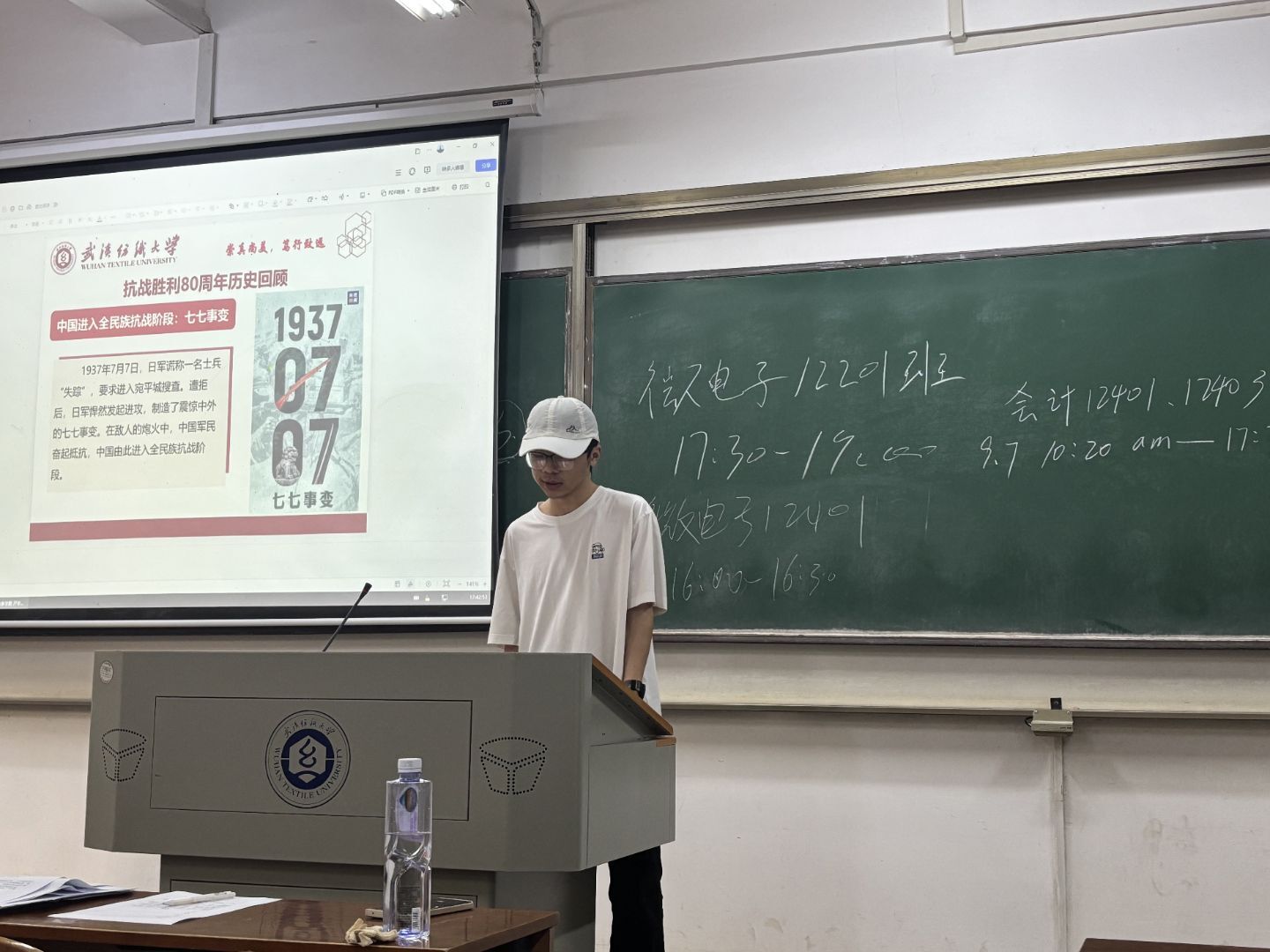 班会伊始,各班级通过PPT展示、历史影像片段播放等形式,带领同学们重温抗战历程。从1931年“九一八事变”揭开世界反法西斯战争序幕,到1937年“七七事变”开启全民族抗战,再到平型关大捷打破日军“不可战胜”神话、百团大战粉碎“囚笼政策”,直至1945年日本宣布无条件投降,一个个关键历史节点的梳理,让同学们直观感受14年抗战的艰苦卓绝。
