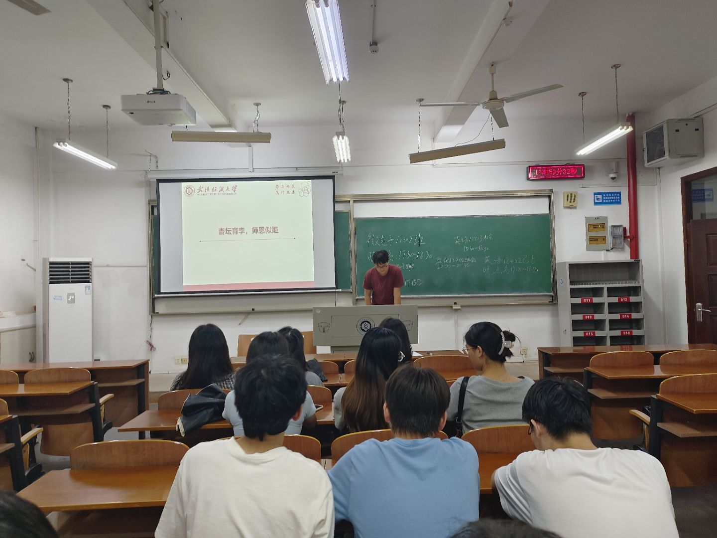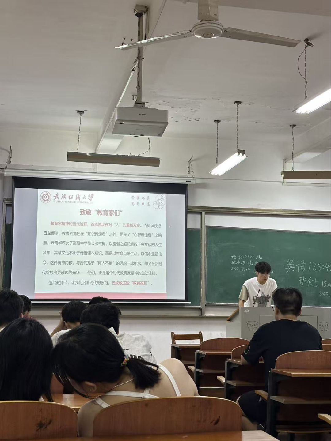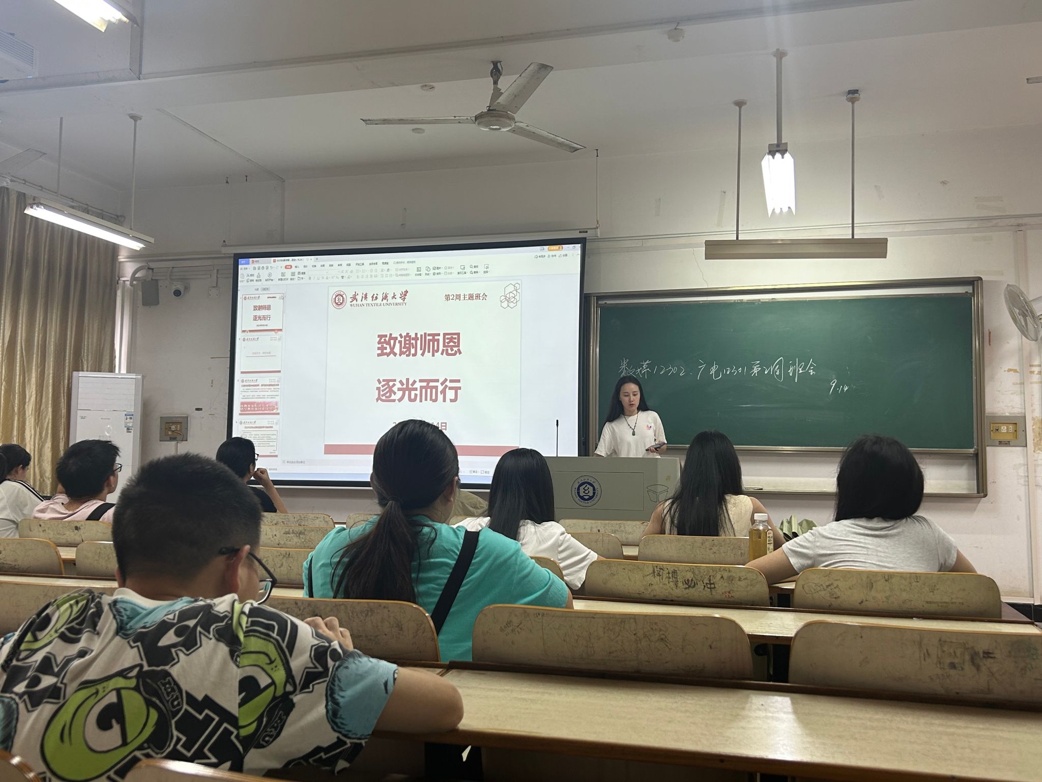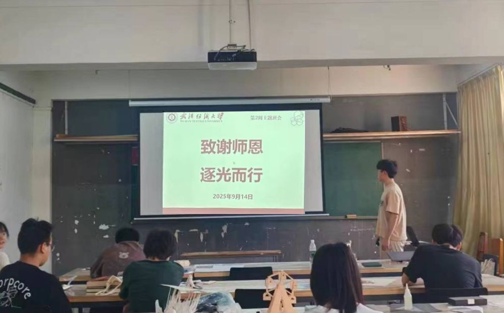 庆祝纺大校庆,厚植尊师文化。班会还特别分享了武汉纺织大学2025年教师节庆祝大会的精彩内容:首映主题微电影《传旗》,取材校园真人真事,以国旗护卫队、月面国旗团队等故事,诠释“韧、忍、仁”的纺大精神与教育家担当;