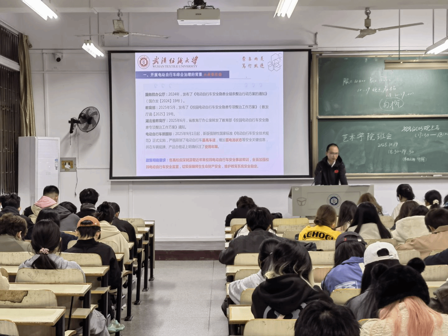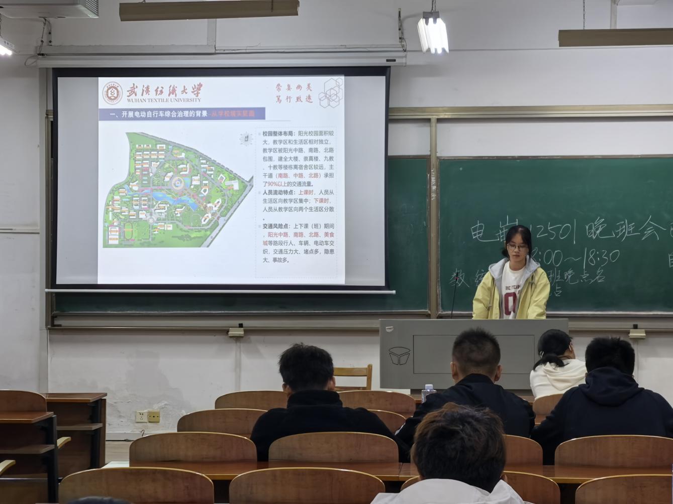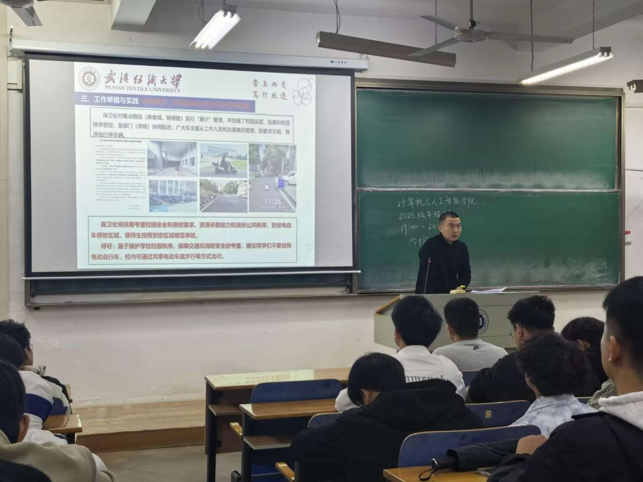 随后,班会结合近期校园管理重点,开展了“共享 共建 共商 共治——校园电动自行车综合治理”主题教育。各班班主任向同学们介绍了当前开展电动自行车综合治理的社会背景与校园现实需求,详细分析了校园内电动车在充电、停放、行驶等方面存在的潜在安全风险,强调了规范管理的必要性与紧迫性。班会重点介绍了学校及学院在电动车综合治理方面已推行的工作举措与实践方案,并明确了下一阶段的重点工作方向,呼吁同学们以“主人翁”姿态,理解、支持并积极参与校园治理,共同营造安全、有序、便捷的校园交通环境。