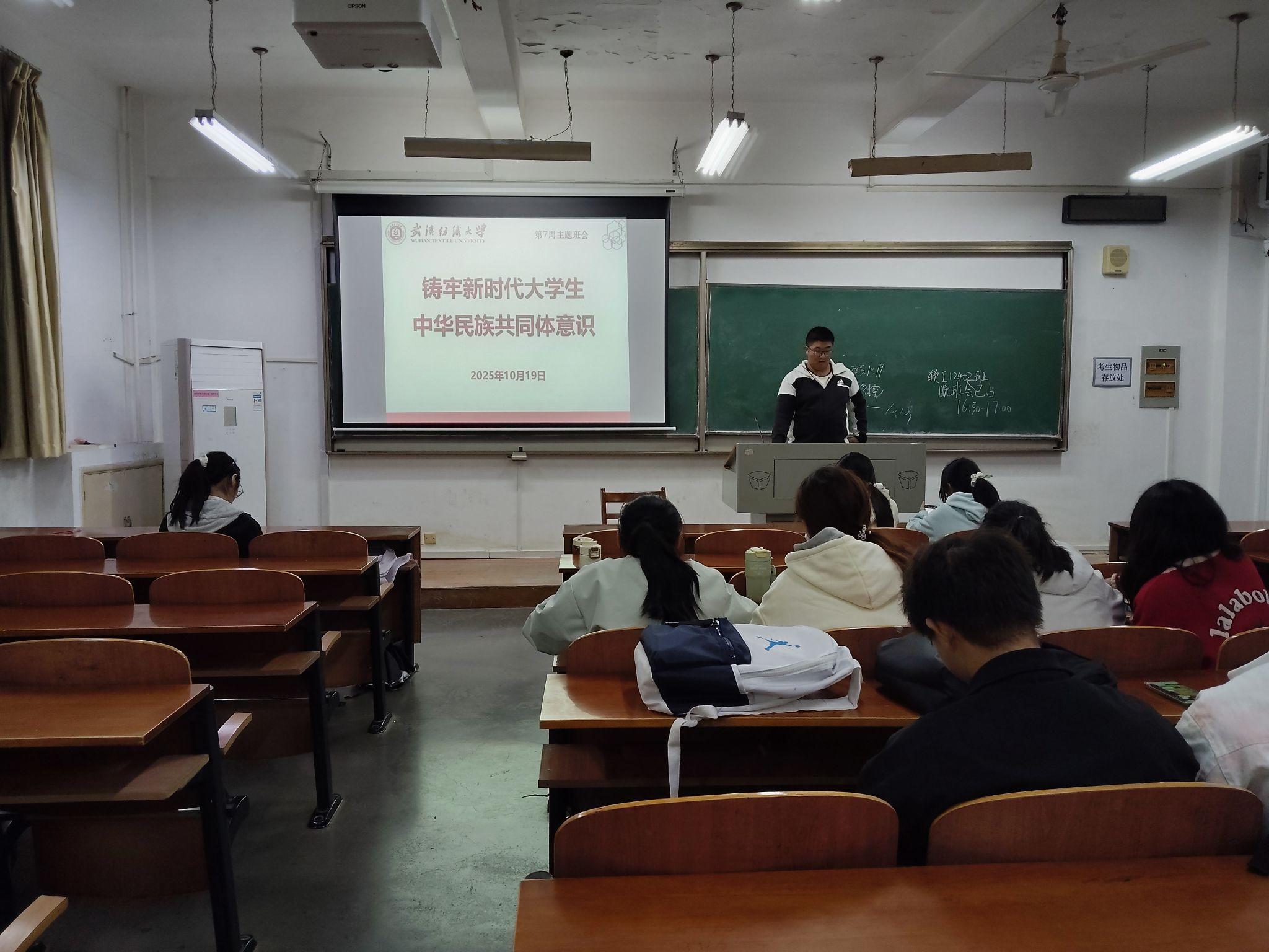 会上,班长结合校园实际与国家政策,分析在大学生中铸牢中华民族共同体意识的时代意义。从国家与社会层面,指出这是维护国家统一、防范民族分裂思想渗透,以及推动高质量发展、发挥多民族人才优势的关键;从学生自身层面,强调其能拓宽个人文化视野、提升跨文化沟通能力,助力同学们将个人理想融入民族复兴大局。同时,班长还结合校园电动自行车综合治理政策,引导同学们在践行民族团结的同时,遵守校园安全规定,共同维护校园秩序。