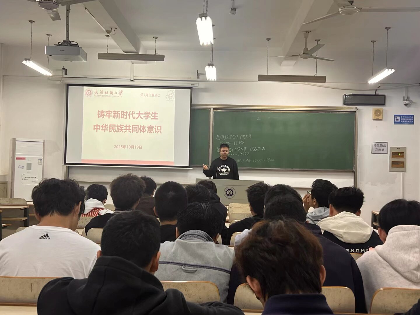 班会上,班主任聚焦核心主题,深入剖析铸牢中华民族共同体意识的战略价值——既关乎国家统一与高质量发展大局,也为大学生拓宽文化视野、明晰人生方向、将个人理想融入民族复兴伟业提供指引。同时,班会结合校园安全管理要求,同步强调电动自行车规范停放、消防安全、专业采风出行安全等注意事项,实现主题教育与安全建设有机融合。