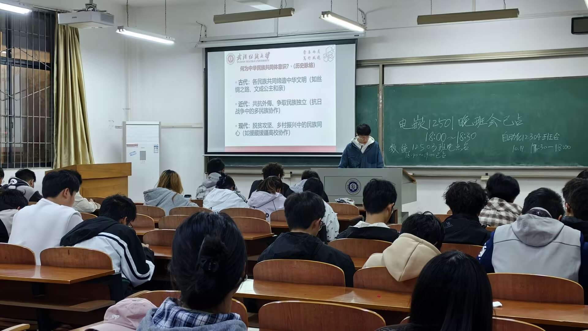 随后,各班围绕 “大学生如何践行中华民族共同体意识” 展开讨论。同学们结合课堂学习与课外实践分享观点,提出要在思政课、专业课中主动学习民族团结知识,选修《中华民族共同体概论》等通识课程;积极参与 “三下乡” 社会实践,调研民族地区非遗保护;在网络空间主动分享民族团结故事,抵制错误言论。班主任对同学们的发言进行总结,勉励大家以实际行动践行 “中华民族一家亲,同心共筑中国梦” 的理念,从身边小事做起,尊重多元文化,主动参与校园民族团结相关活动。