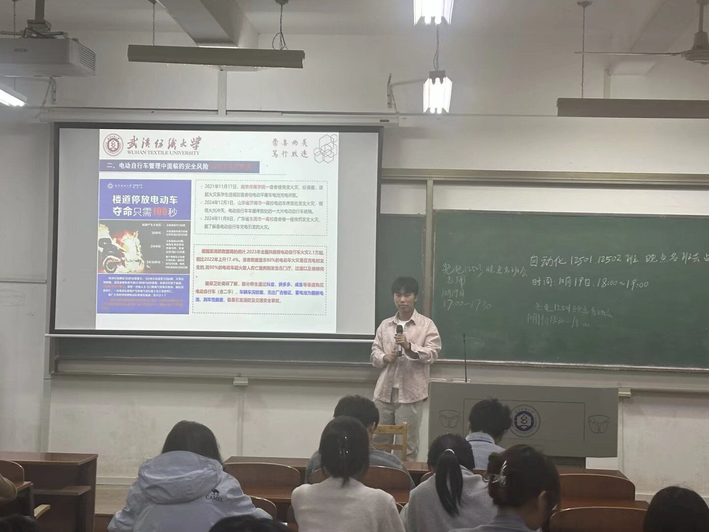 班会播放了其他高校火情视频,结合wedvictor伟德此前发生的电动自行车碰撞致伤案例,直观展示违规停放、充电带来的风险,解读了wedvictor伟德制定的《武汉纺织大学电动自行车管理办法》和采取的治理措施,学校也将启动第三轮实名登记授牌,清理不合规车辆。针对学生关心的“共享电动车高峰期不够用”“充电设施位置”等问题,老师们逐一回应,明确学校将根据潮汐规律增加车辆调度频次、优化停车区域规划,并呼吁学生优先选择共享车辆或步行出行。