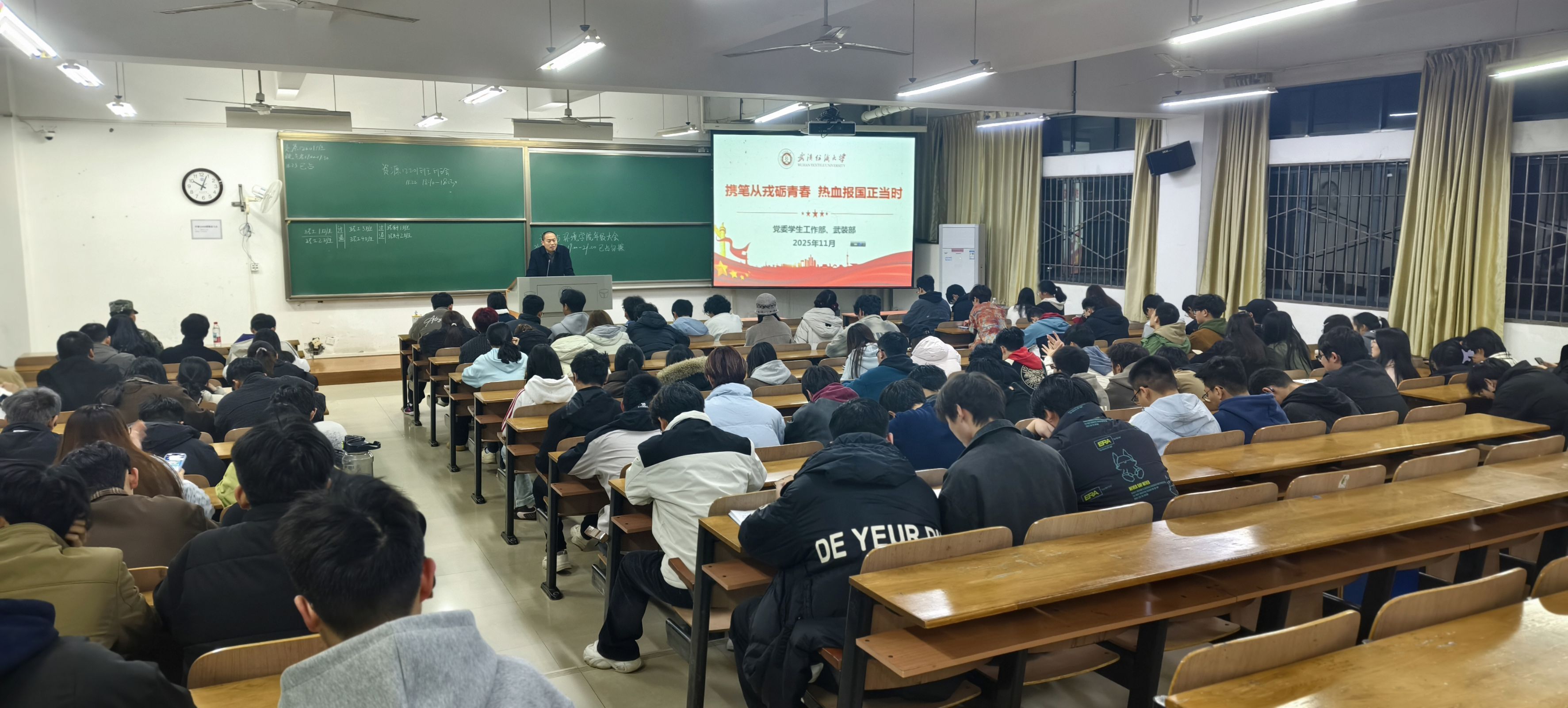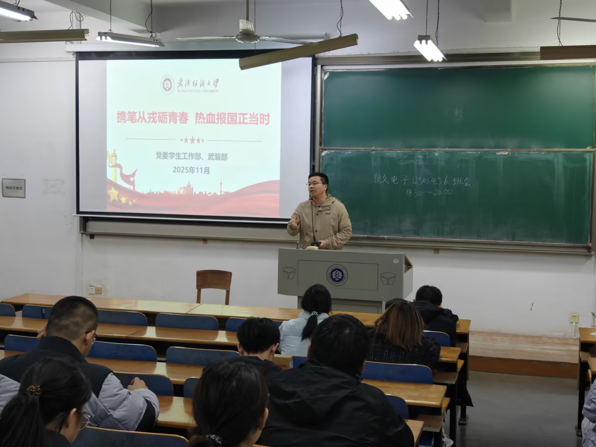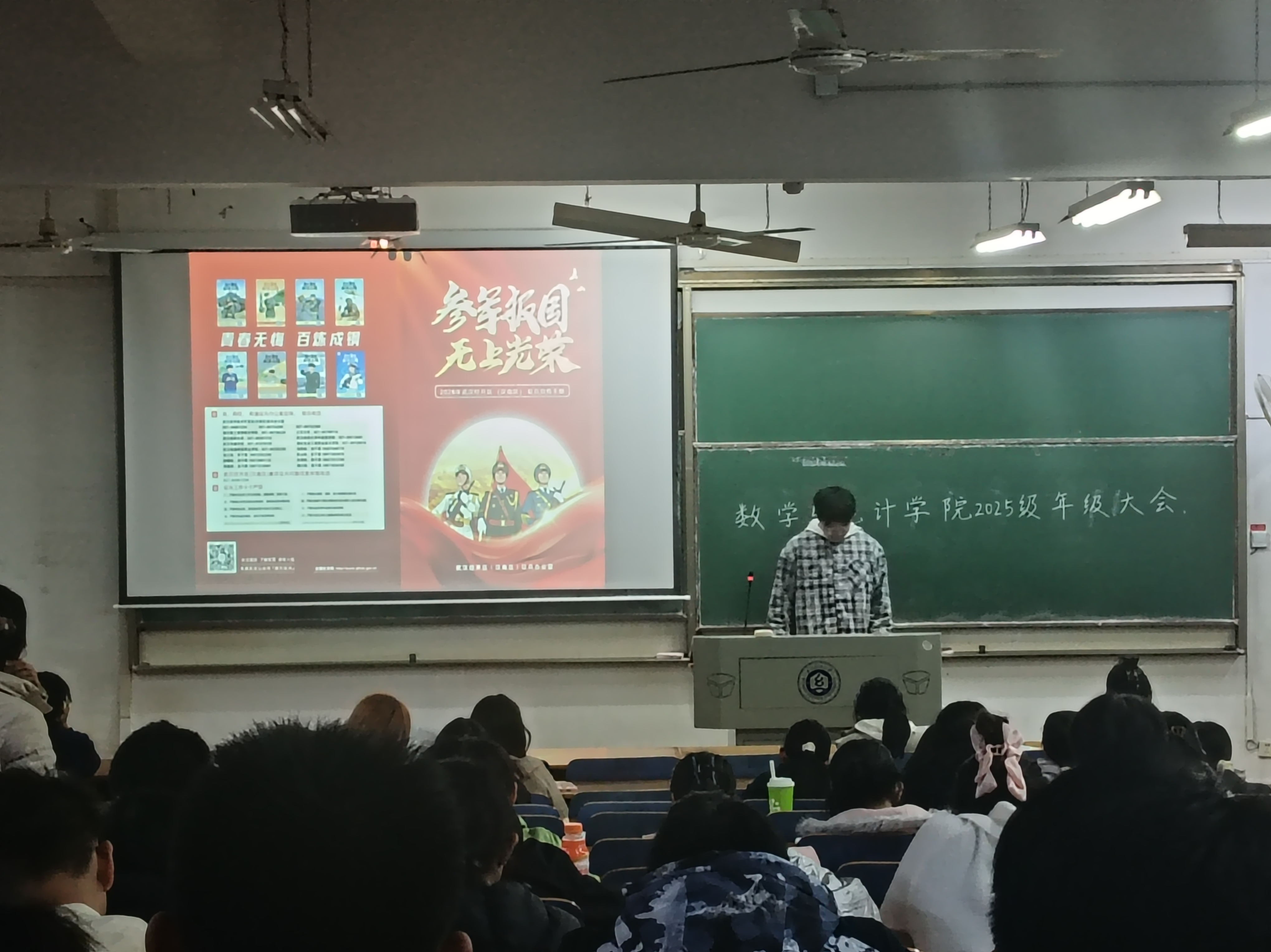 为让同学们对国防建设、参军入伍有更全面的认识和更深刻的感悟,数学与统计学院于2025年11月23日在崇志楼开展了以“携笔从戎立青春,热血报国正当时”为主题的班会,班会由各班班长主持,全体同学参加。