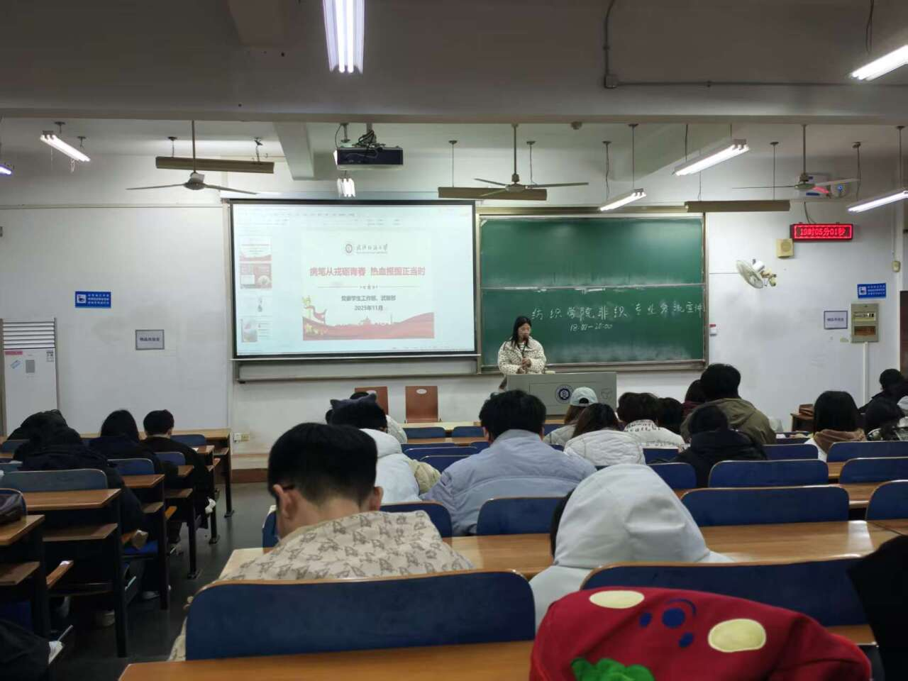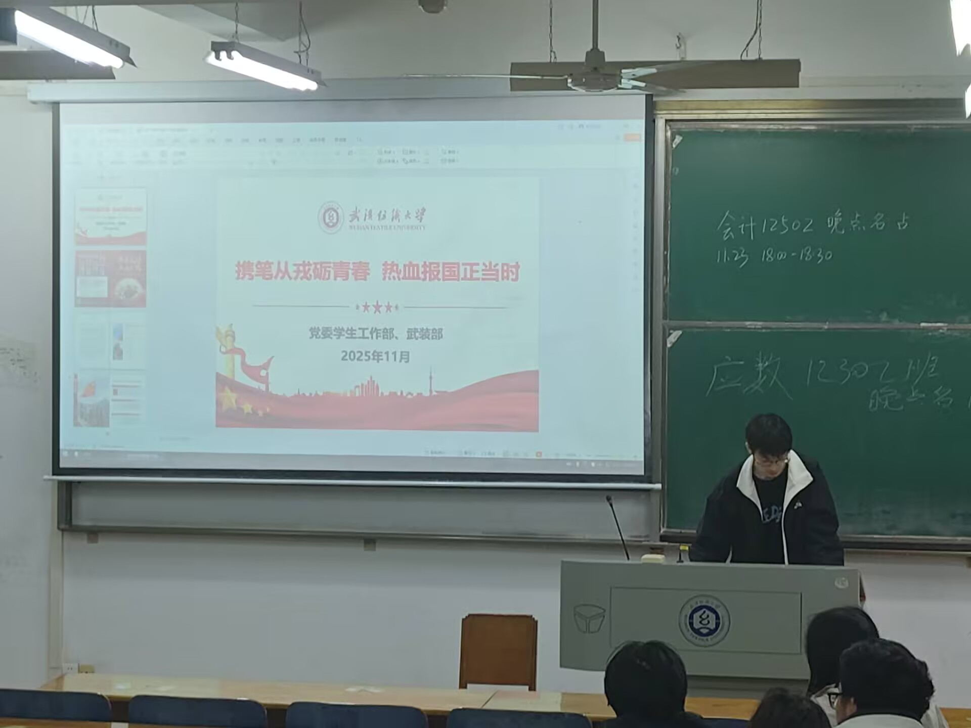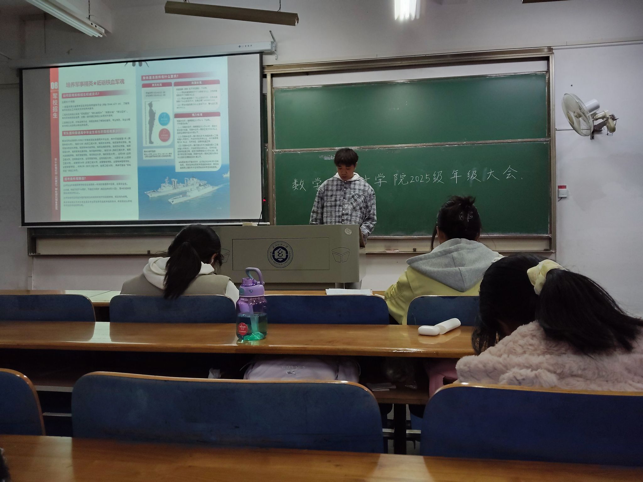 为让同学们对国防建设、参军入伍有更全面的认识和更深刻的感悟,数学与统计学院于2025年11月23日在崇志楼开展了以“携笔从戎立青春,热血报国正当时”为主题的班会,班会由各班班长主持,全体同学参加。