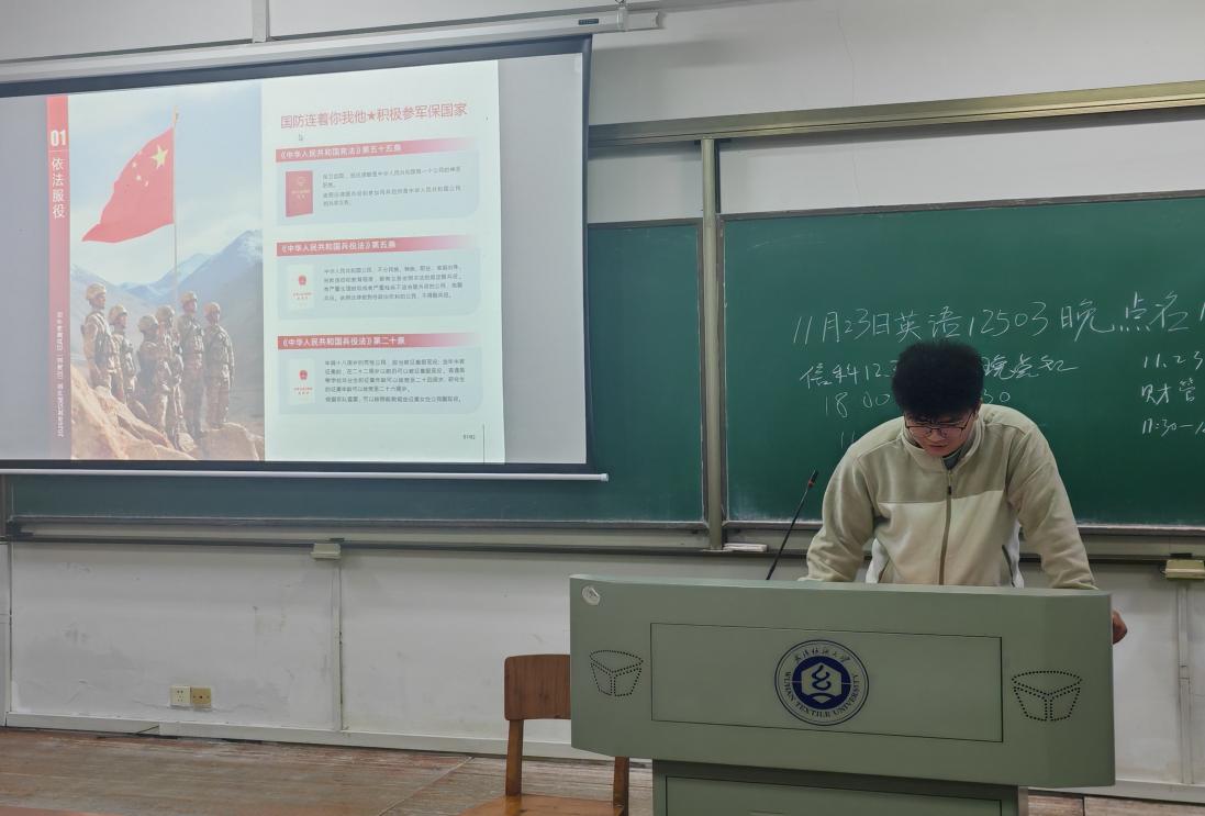 为强化大学生国防意识,引导青年学子树立“从军报国”的责任担当,2025年11月23日晚,学院分年级开展第十二周晚点名活动暨“携笔从戎砺青春 热血报国正当时”主题班会。本次活动以“大学生征兵政策解读”与“国防意识培育”为核心,将政策宣讲与价值引领深度结合,内容详实且富有感召力。