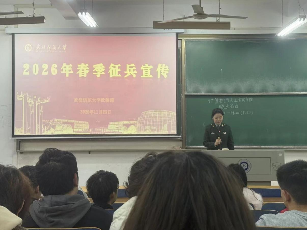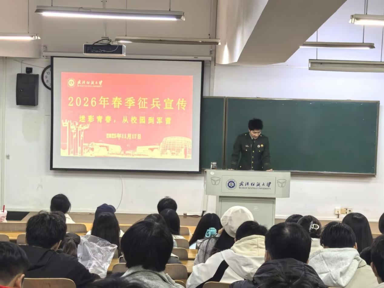 为积极响应国家征兵号召,扎实推进2026年春季征兵宣传工作,激发青年学子投身国防、报效祖国的热情,11月23日,纺织学院组织各班级开展“携笔从戎砺青春,热血报国正当时”主题班会。各班辅导员、班主任主持活动,全体本科生参与。