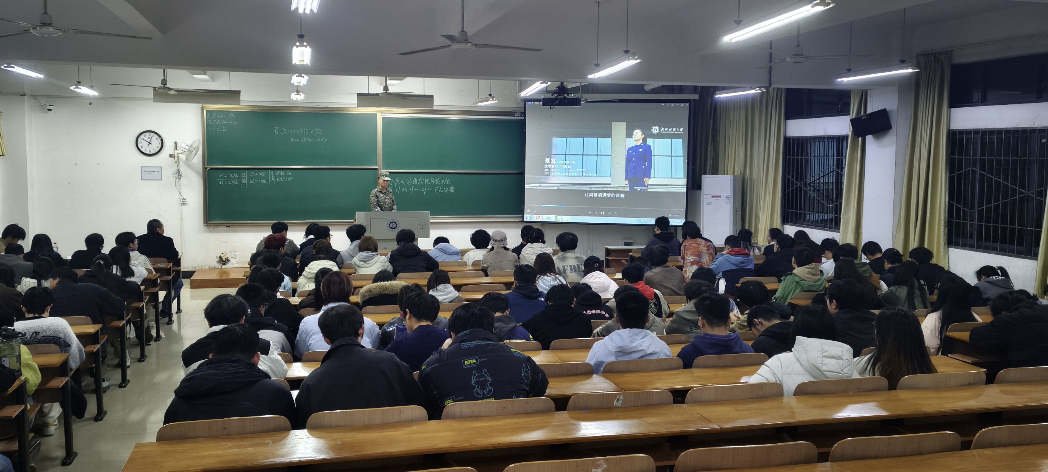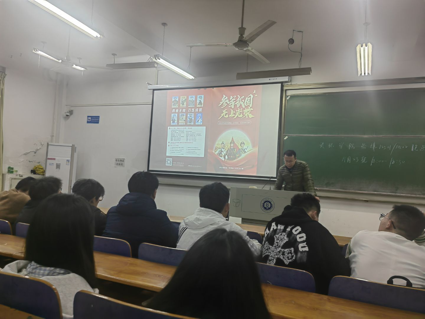 1月23日晚6点-7点,生康学院于7教T-201开展“携笔从戎砺青春,热血报国正当时”主题班会暨征兵宣传“三个一”活动,本次大会由党委学生工作部、武装部统筹,2023级、2024级、2025级全体同学共同参与,辅导员朱一雷主持会议。