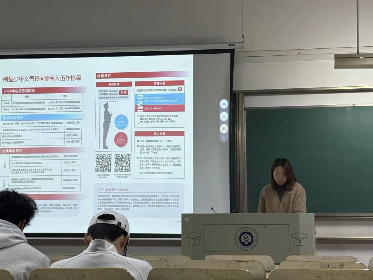 班会主持人向同学们介绍,今年征兵工作突出高素质兵员征集,重点面向高校毕业生、在校生和应届高中毕业生,鼓励理工科、医疗、信息技术等专业青年投身国防,为军队现代化建设注入新鲜血液。同时,军营现代化建设为青年提供了施展才华的广阔舞台,无论是通信技术、数据分析等专业技能,还是组织管理、应急处置等综合能力,都能在军营中得到充分锻炼,为未来职业发展奠定坚实基础。
