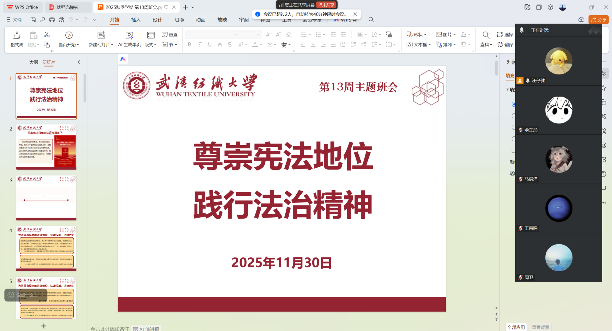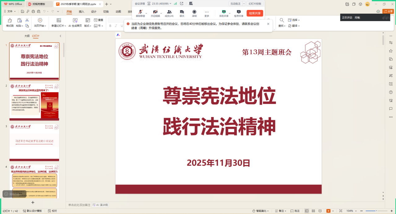 为深入学习宣传习近平法治思想,推动宪法深入人心,引导学生树立宪法意识、增强宪法观念,11 月 30 日,数学与统计学院各班级开展以 “尊崇宪法地位,践行法治精神” 为主题的第十三周班会。本次班会由各班班长主持,全体同学参加。