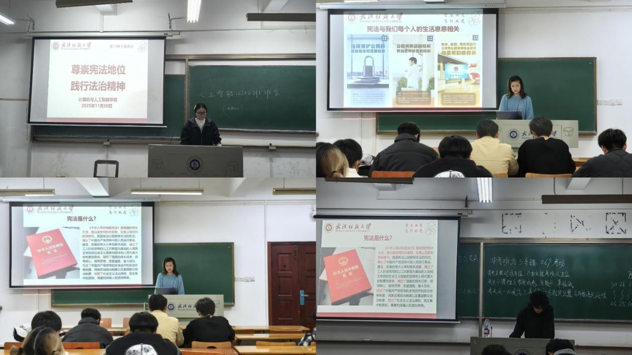 为深入学习贯彻宪法精神,增强青年学生的法治意识和法治素养,计算机与人工智能学院各班于 11 月 30 日在辅导员、班主任的组织下开展“尊崇宪法地位 践行法治精神”主题班会活动。活动以生动多样的形式引导学生树立正确的法治观念,推动宪法精神在校园落地生根。