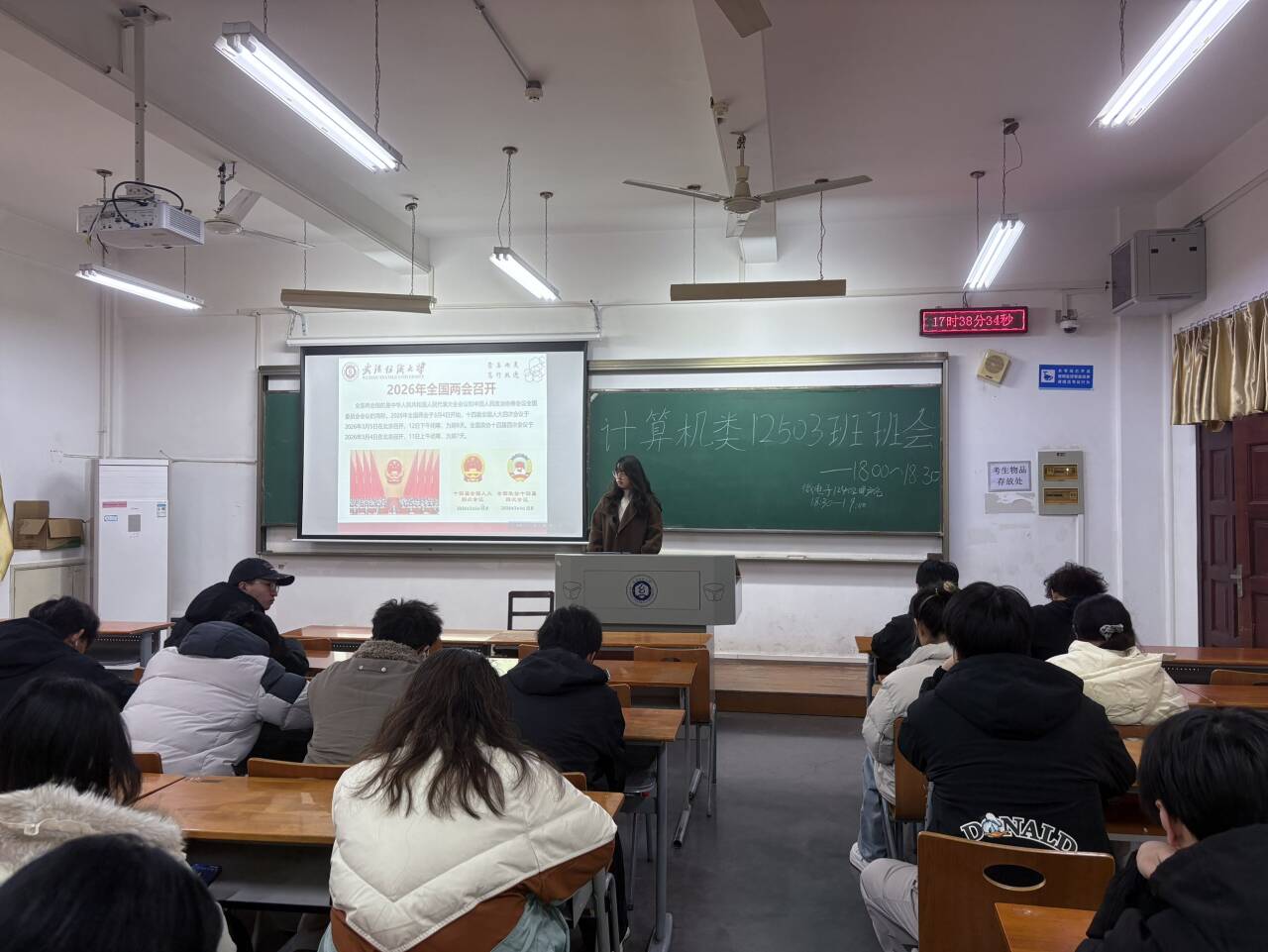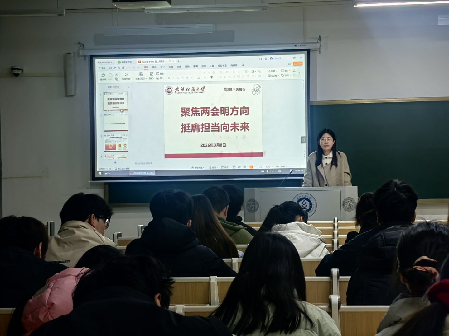 会上,各班班主任组织同学们深入学习2026年全国两会精神,聚焦五大“关键词”解读今年两会热点,带领大家回顾2025年我国经济社会发展成就,展望2026年国家发展的主要预期目标和政策方向。通过学习,同学们进一步理解了“中国式现代化”的深刻内涵,增强了投身强国建设、民族复兴伟业的责任感与使命感。随后,班主任结合武汉纺织大学“双一流”建设攻坚之年的战略部署,号召全体同学以主人翁姿态积极参与学校发展进程,将个人成长融入学校和国家发展大局。