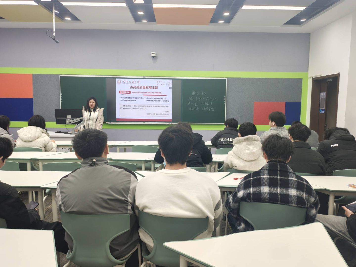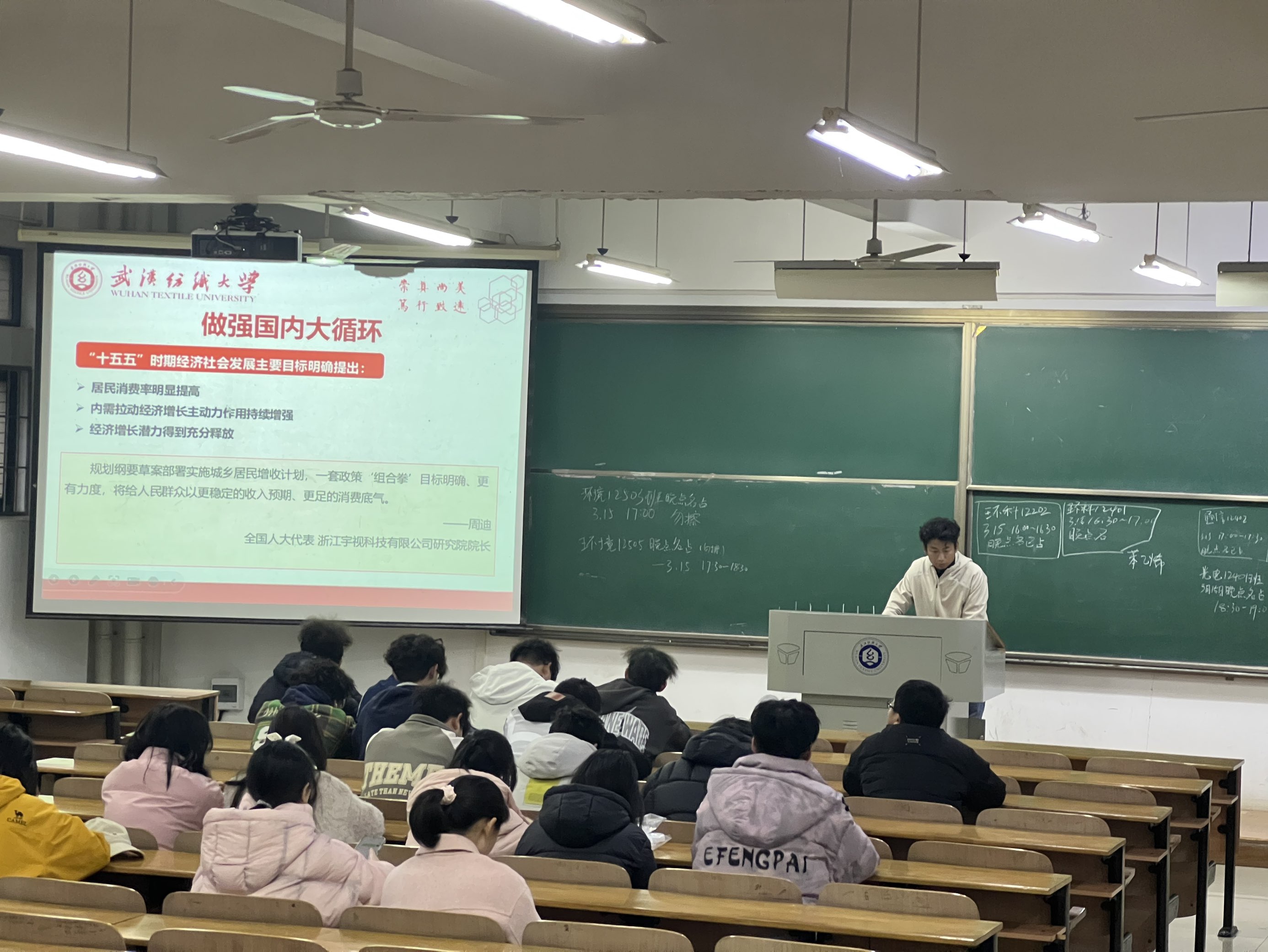 班会现场,辅导员围绕2026年全国两会核心精神,系统解读了“十五五”规划纲要草案中的关键内容。同时结合武汉发展定位,讲解了武汉在各领域的规划与行动,更重点分享了两会上的“纺大声音”,介绍徐卫林院士为传统产业转型升级建言献策的履职实践,展现纺大在科技赋能传统产业中的创新成果与责任担当。