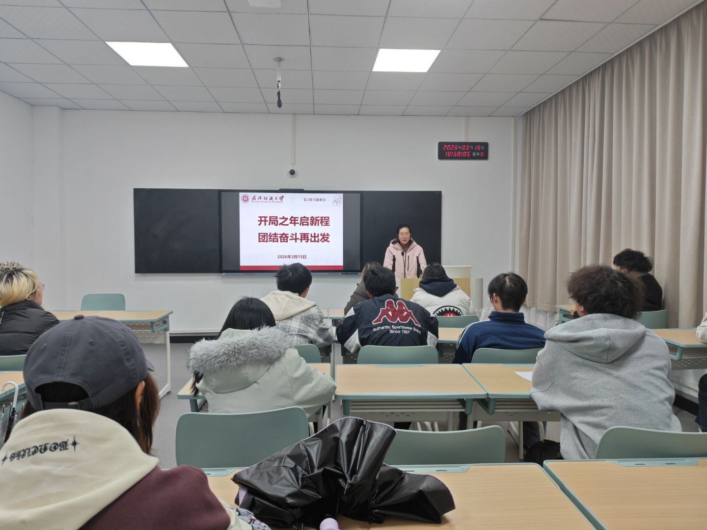 为进一步引导学生深入学习2026年全国两会精神,明确新学期奋斗目标,强化纪律意识与安全观念,伯明翰时尚创意学院于3月15日下午在尚美楼组织召开“开局起步谋新篇,团结奋斗再出发”主题班会。学院党委副书记李斗明、全体辅导员、各班班主任及学生共同参加。
