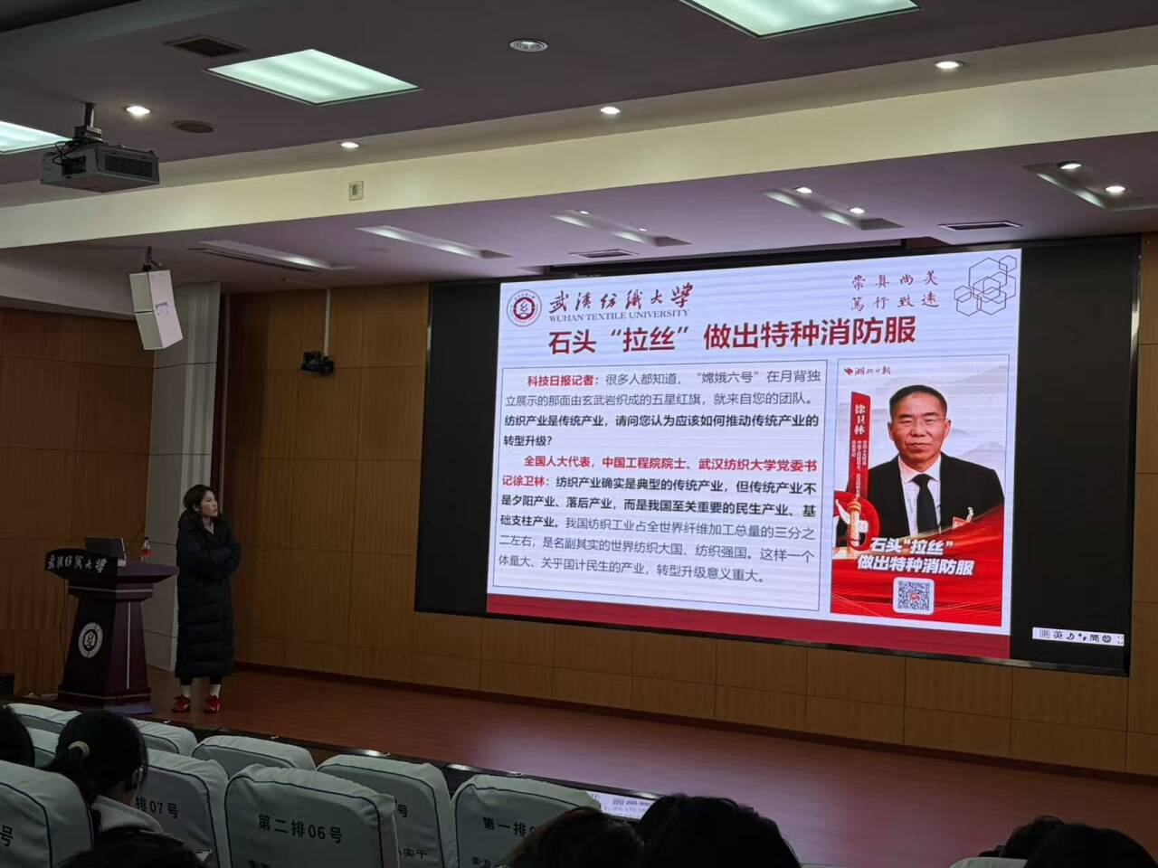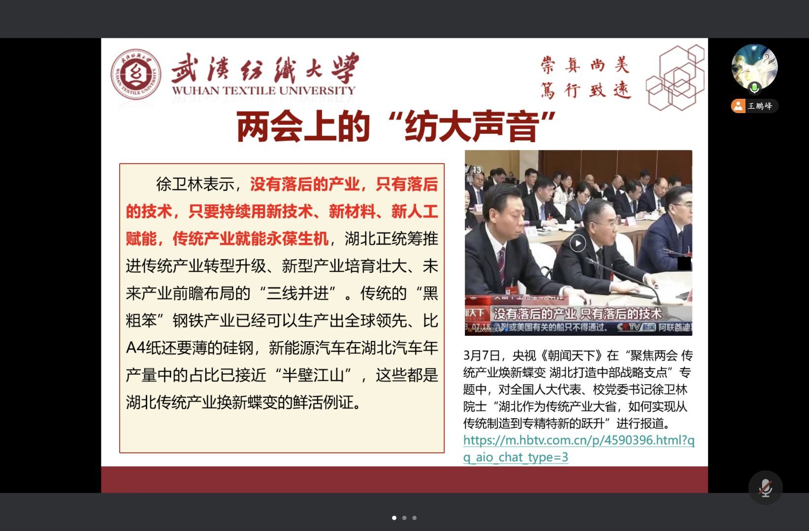 此后,班会聚焦两会中的“纺大声音”。全国人大代表、wedvictor伟德党委书记徐卫林院士在两会期间接受多家媒体采访,围绕传统产业转型升级提出“没有落后的产业,只有落后的技术”的深刻论断,并以玄武岩纤维转化为特种消防服为例,生动展示了纺织产业向高端化、智能化迈进的广阔前景,引发同学们热烈讨论。