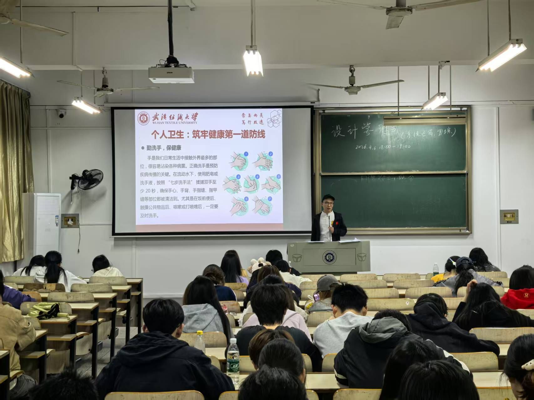 随后,各班围绕第78个世界卫生日“携手共促健康,坚定支持科学”的主题展开学习。同学们从世界卫生日的由来与宗旨出发,系统学习了个人卫生、合理饮食、适量运动、心理健康及环境卫生等健康知识,掌握了“七步洗手法”、“三减三健”(减油、减盐、减糖,健康口腔、健康体重、健康骨骼)等实用技能。在心理健康环节,同学们认识到要积极面对情绪、勇于寻求帮助。此外,各班还重点介绍了国家“体重管理年”三年行动,结合国家卫健委发布的《成人肥胖食养指南》,展示了华中地区的四季食谱,强调科学减脂、健康体重,并温馨提醒:“胖瘦都很美丽,减脂是为了健康。”